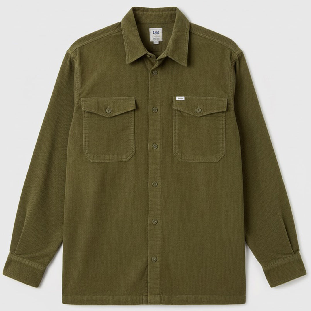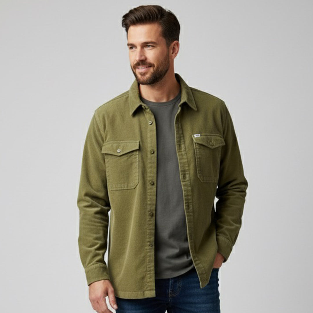 قميص رجالى قطيفه مضلع ساده بجيوب امامية لون زيتي